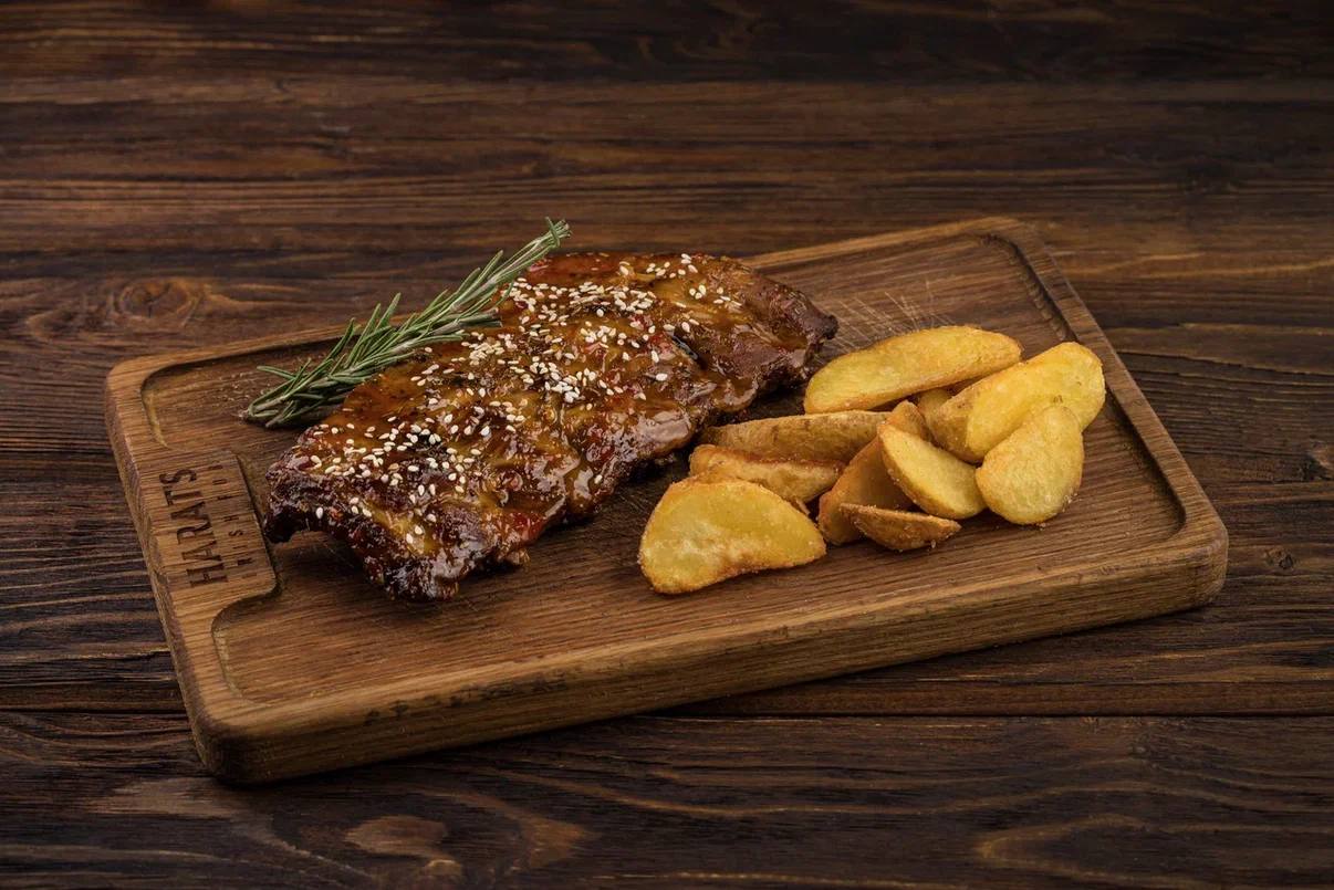 Свиные ребра запеченные в соусе сладкий Чили, подаются с картофельными дольками