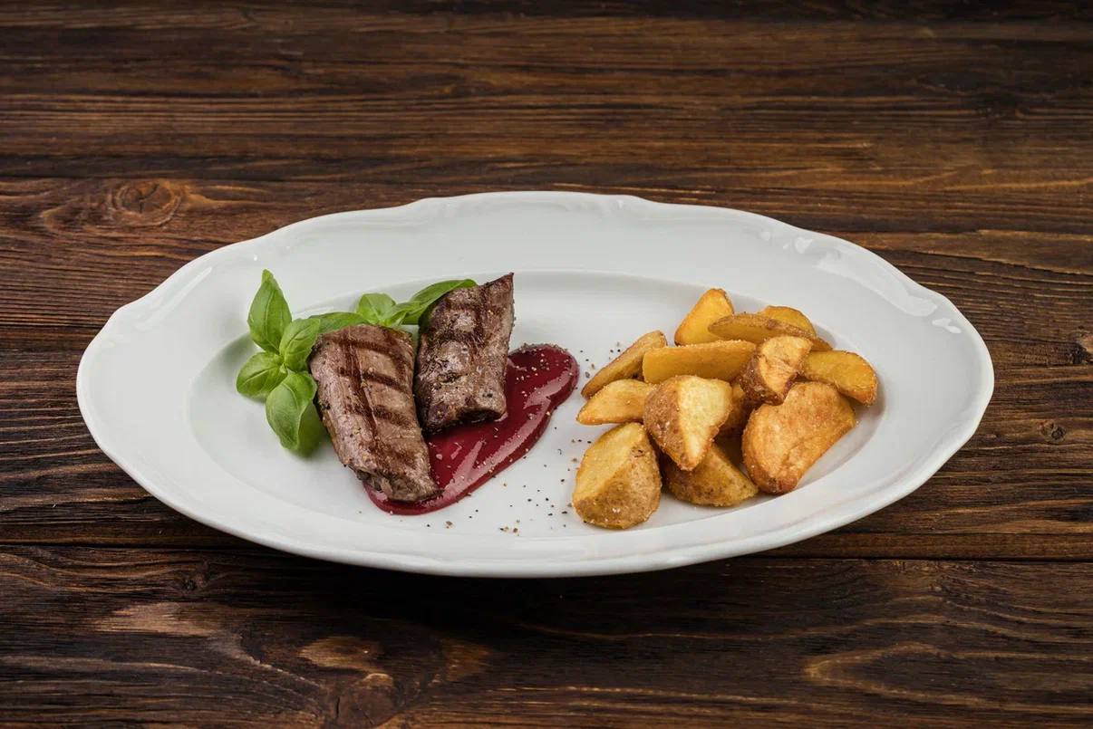 Нежная вырезка ягненка , подается с картофельными дольками и малиновым соусом.