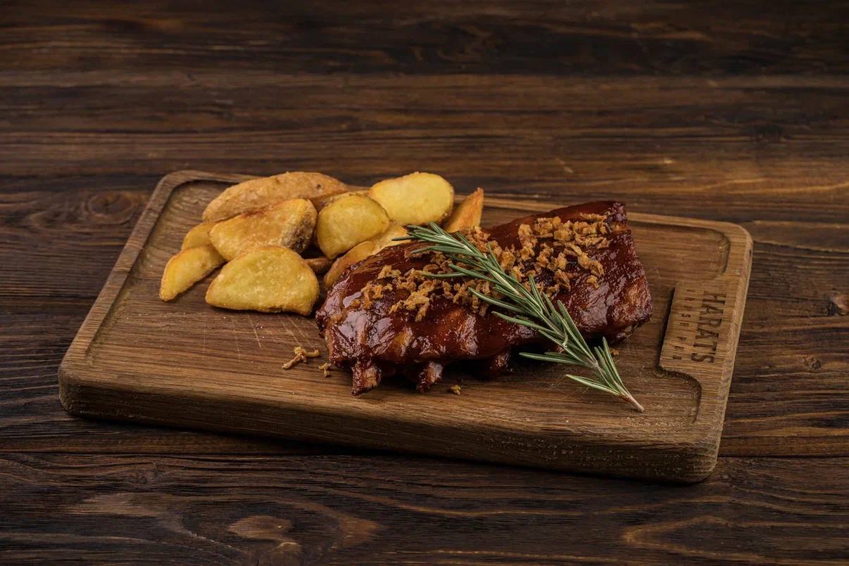 Запеченные свиные ребра в соусе BBQ , подаются с картофельными дольками