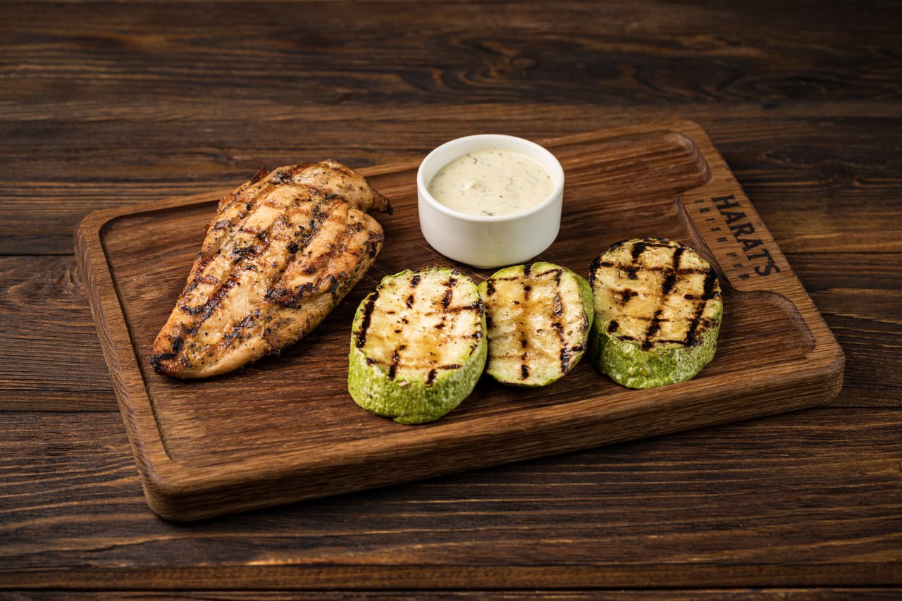 С гарниром из цукини и соусом Ранч.