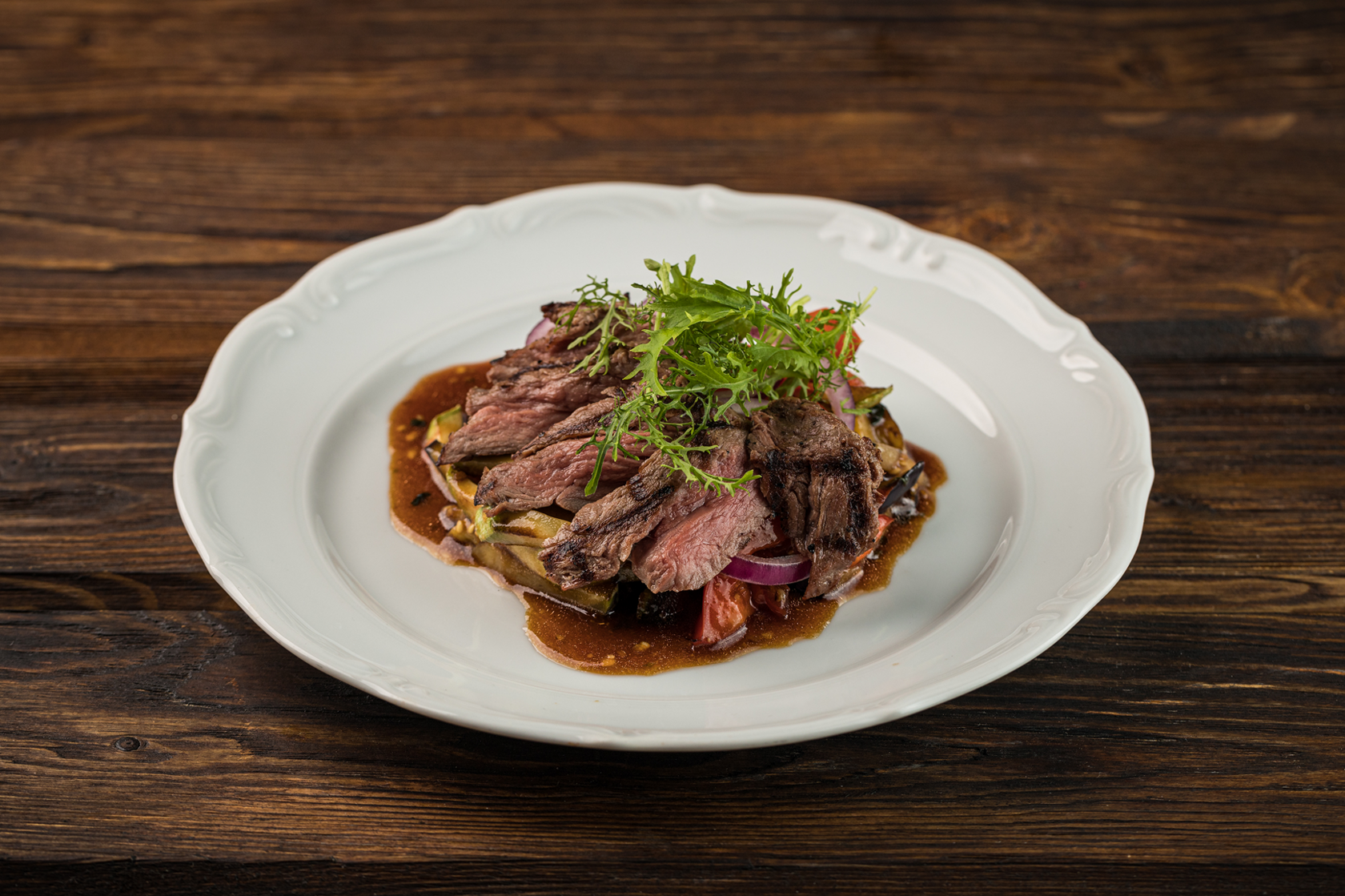 Говяжья вырезка medium well, обжаренная на гриле, подается с подпеченными овощами и восточным соусом