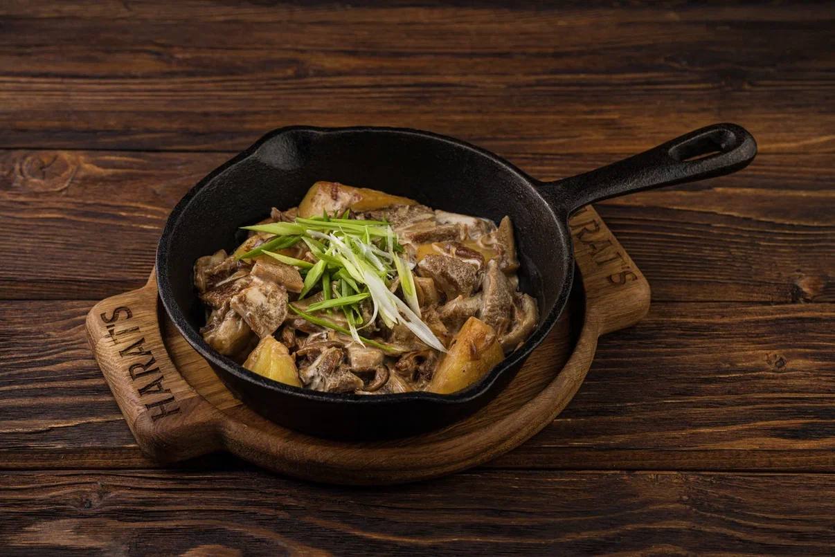 Наш хит: нежная свиная вырезка, обжаренная с картофелем, ароматными вешенками и репчатым луком. Подается со свежим зеленым луком и бочковым помидором.