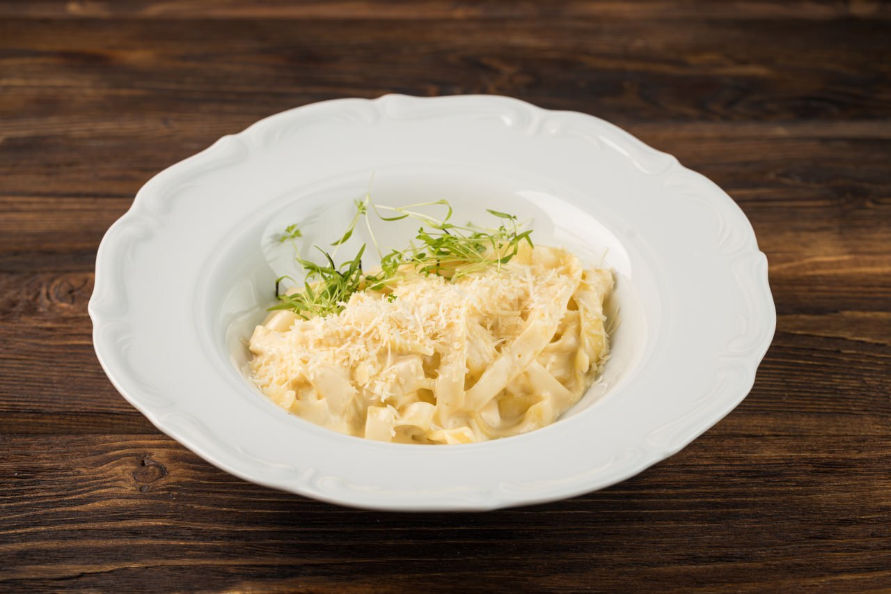 Паста фетучини в сливках с сыром Дор-Блю, Чеддер, Моцарелла и Пармезан