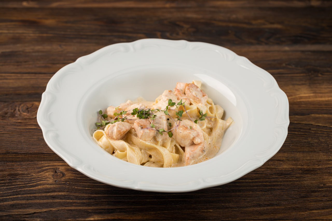Паста с креветками и лососем