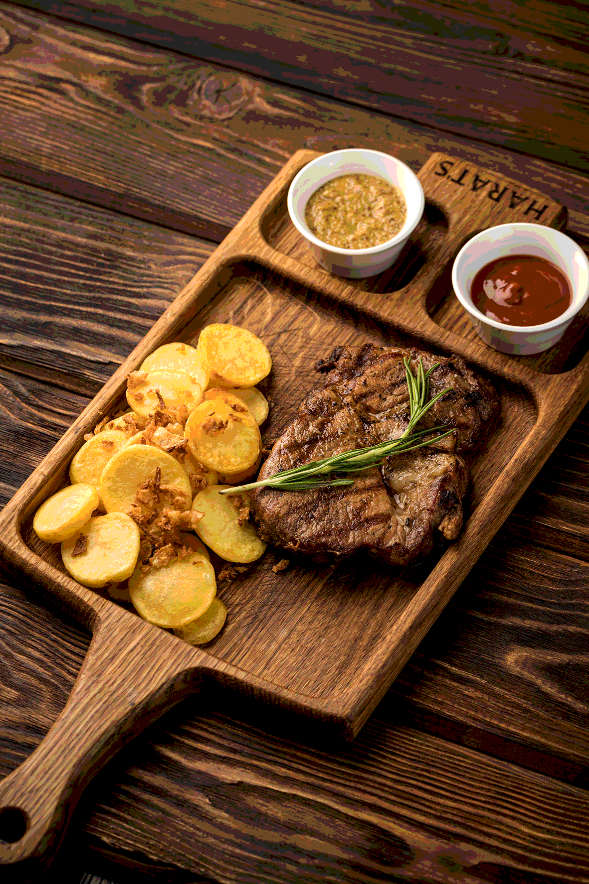 Сочный стейк из свининой шеи, обжаренный на гриле, подается с хрустящими картофельными слайсами и соусом барбекю и горчичным.
