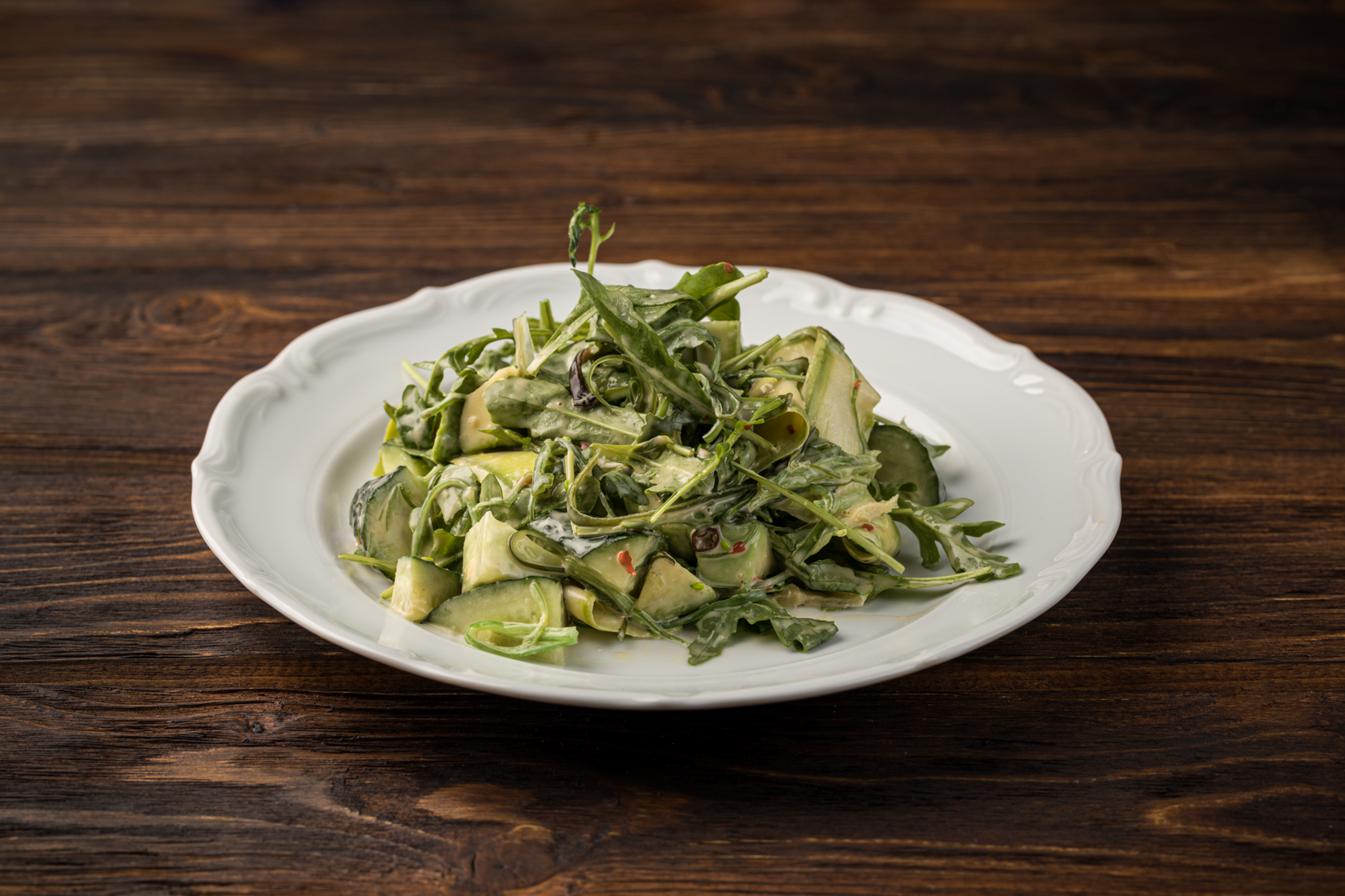 Легкий салат с авокадо, свежим огурцом, рукколой, чукой под ореховым соусом.