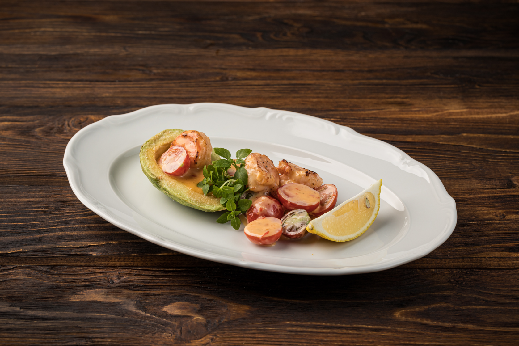 Запеченное авокадо с обжаренными тигровыми креветками, сладкими томатами черри и пикантным ореховым соусом