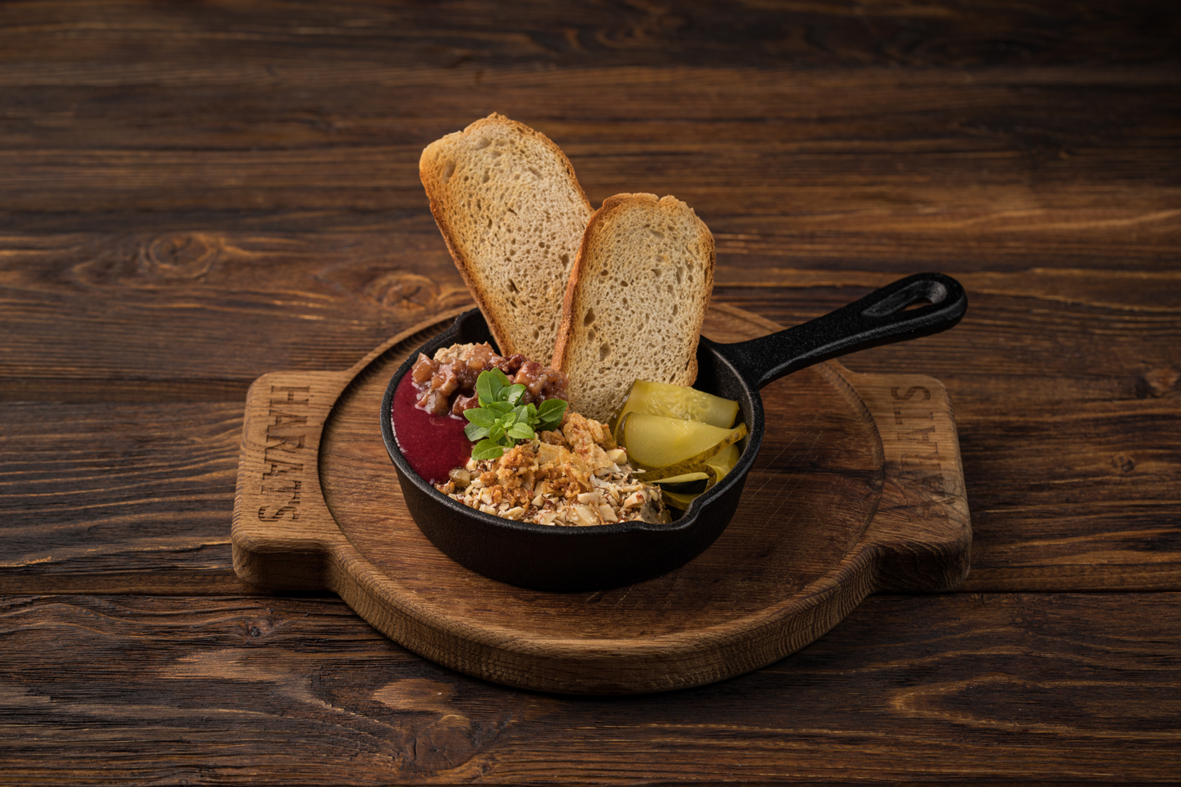 Нежный паштет из куриной печени с жареным луком, брусничным соусом и орехами. Подается с хрустящими гренками и слайсами бочкового огурца